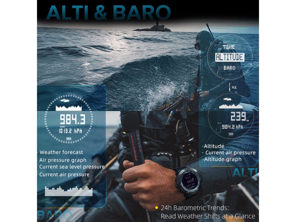 Apache D nabízí širokou škálu funkcí – od měření kroků a spálených kalorií, přes stopky, odpočítávání a budíky, až po profesionální nástroje pro outdoor. Výškoměr, barometr, teploměr a kompas vám pomohou při horských túrách i orientaci v neznámém terénu.