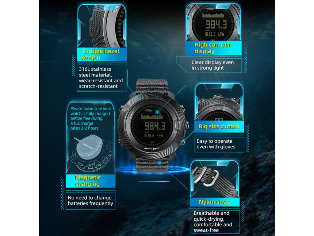 Hlavní klíčová slovaNorth Edge Apache Doutdoorové hodinky Apache Dsportovní hodinky s výškoměrem hodinky pro potápění 10ATM freediving hodinky odolné sportovní hodinky